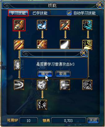 手動(dòng)學(xué)習(xí)技能:等級(jí)達(dá)到20級(jí)后,您可以自己學(xué)習(xí)技能。學(xué)習(xí)技能必須消耗SP點(diǎn),到后期SP點(diǎn)不足以讓您升級(jí)全部技能,這時(shí)需要您有所取舍。