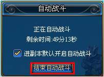 鼠標(biāo)左鍵點(diǎn)擊“進(jìn)入副本默認(rèn)開(kāi)始自動(dòng)戰(zhàn)斗”前面的復(fù)選框可以取消進(jìn)入副本自動(dòng)戰(zhàn)斗的功能。左鍵點(diǎn)擊“自動(dòng)戰(zhàn)斗”窗口中的“結(jié)束自動(dòng)戰(zhàn)斗”可以停止自動(dòng)戰(zhàn)斗。