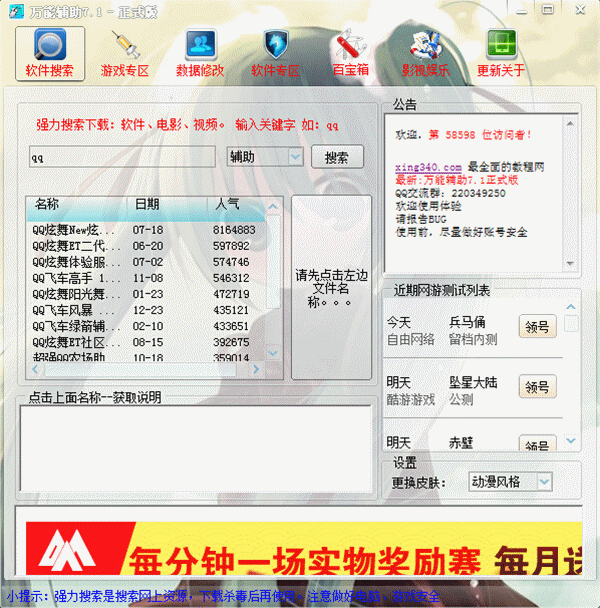 網(wǎng)游萬能輔助不僅僅提供游戲腳本的制作,它還是一個集娛樂休閑為一體的綜合性小軟件,為玩家提供看電影、小說、領(lǐng)取新手卡、內(nèi)置答題、殺毒軟件、工具箱、在線網(wǎng)絡(luò)電視等多種功能。