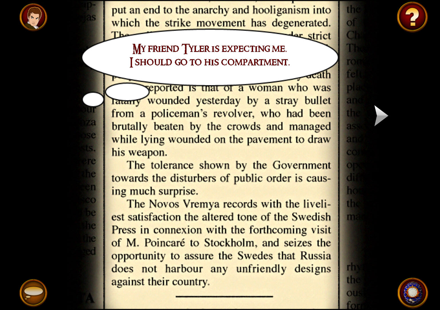 真實世界這是一個完全不同于以往的偵探游戲世界,以往的偵探游戲往往都需要主動去尋找線索,可能點(diǎn)擊一個物品或者開啟段對話才能開啟接來的劇情,整個游戲相對于玩家而言是“死”的,只有玩家才是“活”的。但是這款游戲就不一樣了,玩家并不需要找人來談話,因為他們會主動找玩家交流,提供一些或真或假的情報。同時這些NPC也會對玩家的舉動作出反應(yīng),比如玩家在餐廳坐的時間太久了,甚至還會引起身后兩位夫人的非議,非常具有真實性。