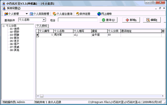 小巧名片管理系統(tǒng) V2.1 綠色特別版 名片本身是聯(lián)系信息,各種各樣的聯(lián)系信息毫無疑問是您非常寶貴的無形資產(chǎn).小巧名片管理系統(tǒng)主要是為了管理您長期積累下來的眾多名片而設(shè)計,當(dāng)然也可以用來管理您的其他聯(lián)系信息.