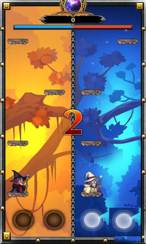 游戲到底怎么玩?畫面中我們只看見四個圈圈。黑白各兩個,到底怎么操控?也沒有新手教程,經(jīng)西瓜一番研究之后發(fā)現(xiàn),原來這四個圓圈分別是用來操控黑白魔法師向上跳躍的,敏捷根據(jù)不規(guī)律的石階左右移動跳躍而上,收集寶石即可。