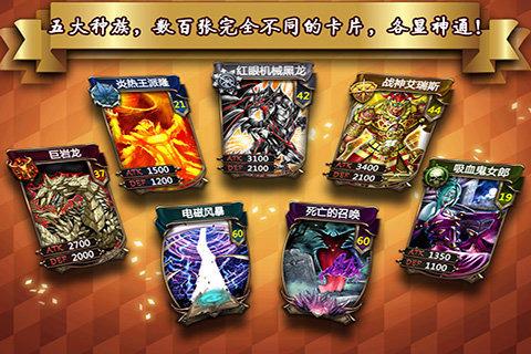 實時PVP競技和來自全國的高手對戰(zhàn),配合豐富的游戲卡組,游戲中有250張不同技能的怪獸卡,100張絢麗的魔法卡,50張陷阱卡。只有最強的玩家,沒有最強的卡牌。