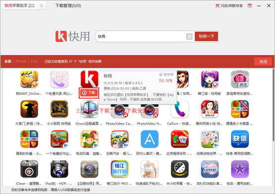 2.若您的設(shè)備已接入電腦且已經(jīng)安裝快用pc端的用戶,搜索”快用“,在搜索結(jié)果中點(diǎn)擊“下載”即可下載安裝快用移動端并正常使用。