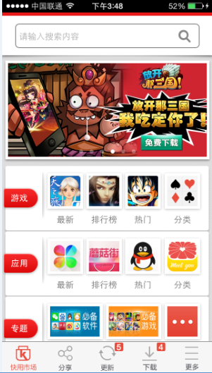 快用蘋果iPad助手是iPad用戶最受歡迎的應(yīng)用下載平臺,不越獄裝軟件的唯一選擇,海量正版軟件游戲,每日都有新增,全部免費(fèi)安裝,不需理會手機(jī)是否越獄,不用掌握itunes,不用注冊登錄,選擇應(yīng)用,下載安裝,精彩您的平板生活。
