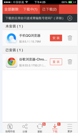 快用啟動時會檢查應(yīng)用是否為最新版本,如果不是最新版本應(yīng)用將會顯示在更新列表中