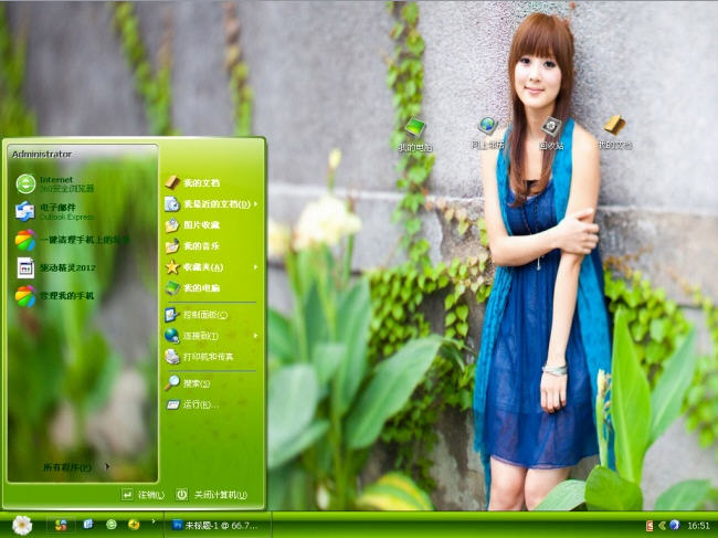 放飛心情電腦主題是一款小清新風(fēng)格的xp電腦主題,這款電腦主題的桌面背景是一個(gè)非常漂亮的妹子靠在滿是爬山虎的圍墻上,然后襯托綠色的植物,讓人感覺很清爽。