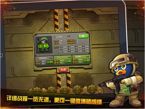 8、曬曬你的戰(zhàn)績:結(jié)算界面包含你的殺敵統(tǒng)計以及攻防指數(shù),可以一鍵分享到你的微博,向大家曬曬你的成績!