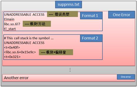suppress 文件有多個(gè)”O(jiān)ne Error”小節(jié)組成,每個(gè)”O(jiān)ne Error”表示一個(gè)可以被 suppress 的錯(cuò)誤。用調(diào)用堆棧來表示,有兩種格式來表示堆棧: