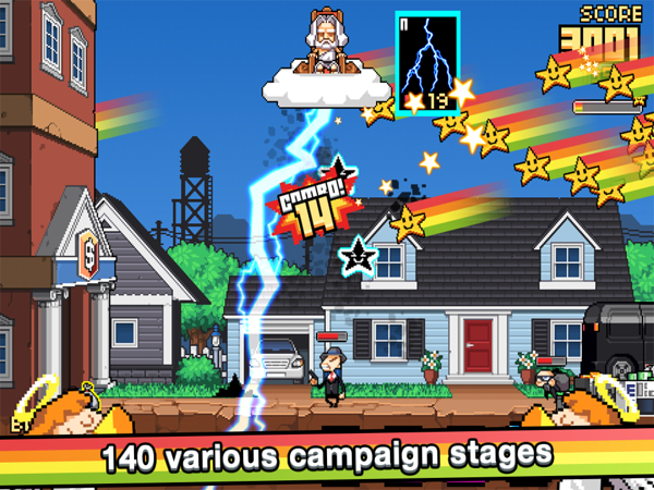 《上帝的懲罰2God Strike 2》是由Magic Cube公司制作并發(fā)行的,游戲基本上延續(xù)了前作的風(fēng)格,街機(jī)風(fēng)格的2D畫面,其中還帶有一些像素元素,閃電效果也是非??鋸?,也是為了更加爽快的懲罰那些壞蛋。游戲的音樂節(jié)奏比較輕快,聽起來讓人神清氣爽。游戲當(dāng)中準(zhǔn)備了多種人物供玩家選擇,從雷神到上帝,每一個(gè)人物都有一個(gè)專屬的技能,利用專屬技能可以更快的清除屏幕中的惡霸們。游戲的操作方式并不復(fù)雜,采用的是典型的觸屏手勢(shì)方式,不過由于每個(gè)人的技能不同,釋放的操作在細(xì)節(jié)上也會(huì)稍有不同。隨著游戲的進(jìn)展,玩家可以解鎖人物,當(dāng)解鎖后會(huì)有詳細(xì)介紹人物的專屬技能以及操作方式,玩家并不用擔(dān)心面對(duì)新人物會(huì)手足無措。