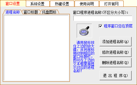 在添加窗口標題或進程名時,程序還提供了非常簡捷方便的操作:用鼠標按住程序主窗口中的放大鏡,然后拖動到任意窗口,即可在程序編輯框中顯示窗口標題或進程名。對于窗口標題,你可以簡單的編輯,只保留關(guān)鍵詞,也可以全部添加。對于進程名,則直接添加即可。