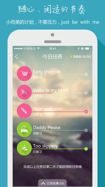 更有各種貼心:離線使用,不用流量;解鎖模式,節(jié)節(jié)升級;一鍵回顧,自動連播;合理復(fù)習,長效記憶。