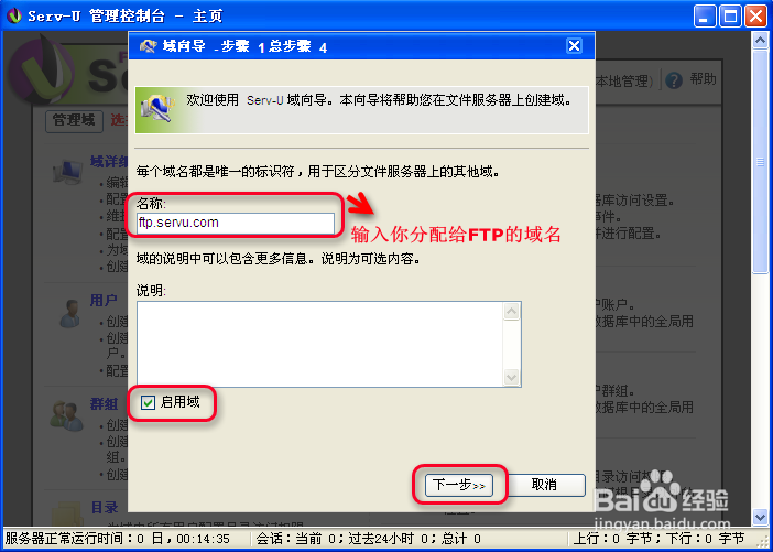 我們點是,來創(chuàng)建新域,輸入你分配給FTP的域名,然后勾選啟用域,然后點下一步,如下圖所示: