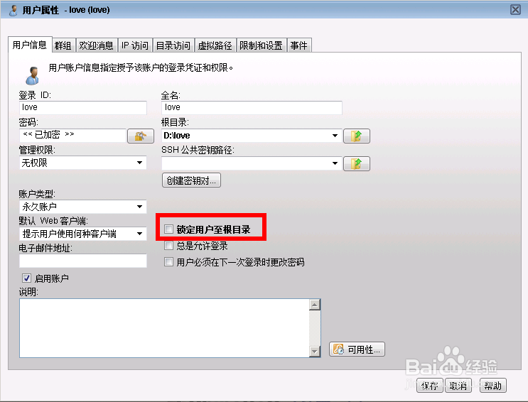 注:如果選中鎖定用戶至根目錄后則此根目錄的權(quán)限決定了 根目錄下所有目錄的權(quán)限。如果根目錄下有不同的目錄,不同的目錄有不同的權(quán)限的話,請勿選中鎖定用戶至根目錄。