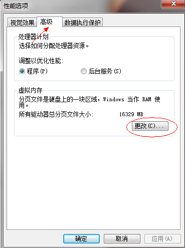 3、在性能選項(xiàng)的“高級(jí)”中點(diǎn)擊“更改”;