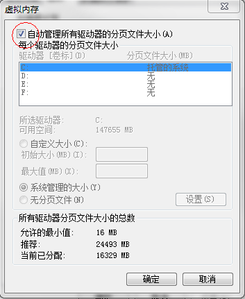 4、將“自動(dòng)管理所有驅(qū)動(dòng)器的分頁文件大小”勾去掉。