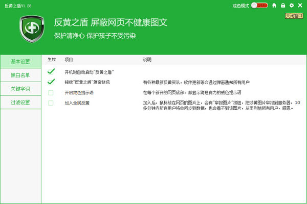 屏蔽網(wǎng)頁(yè)中的不健康圖片為達(dá)到較好保護(hù)兒童和青年人不受網(wǎng)絡(luò)不健康信息影響,反黃之盾通過(guò)采用關(guān)鍵字過(guò)濾、人工過(guò)濾等方法,比較有效地屏蔽了網(wǎng)頁(yè)中的不良圖文,幫助用戶更好地避免受到不健康圖文的干擾和影響。