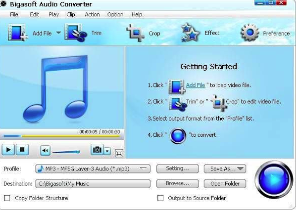 Bigasoft Audio Converter是一款易于使用的音頻轉(zhuǎn)換工具,可以在不同的音頻格式間進行快速轉(zhuǎn)換,支持的音頻格式包括MP3、WMA、M4A、AAC等。這款數(shù)字 音頻轉(zhuǎn)換器同時也是MP3轉(zhuǎn)換器、WMA轉(zhuǎn)換器、M4A轉(zhuǎn)換器等等。而且,這款MP3音頻轉(zhuǎn)換器支持批量轉(zhuǎn)換,從而可以一次性地轉(zhuǎn)換多個音樂文件,幫助您 輕松聆聽您的美妙音樂。此外,它還可以從所有電影或MTV中快速提取高品質(zhì)音樂,它支持的視頻格式包括AVI, MPEG, MP4, MPG, 3GP, DivX, Xvid, ASF, VOB, MKV, WMV, H.264等。