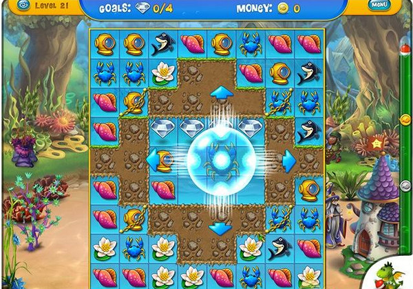 在《魚之王國(guó):時(shí)間深處》中,只要將3個(gè)相同的物體連載一起即可完成消除,隨著游戲進(jìn)行,通關(guān)的條件也不同,有需要清楚障礙的,也有讓鉆石落到最下面的,同時(shí)各種障礙也會(huì)越來(lái)越多。當(dāng)玩家一次性消除大于4個(gè)物體的時(shí)候,也會(huì)出現(xiàn)獎(jiǎng)勵(lì)效果: