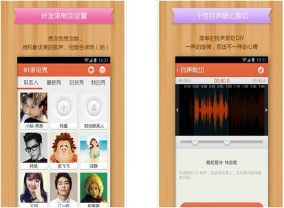 91來(lái)電秀是一款非常炫酷的手機(jī)來(lái)電軟件,除了普通來(lái)電秀軟件所包含的來(lái)電歸屬地顯示,電話(huà)回?fù)?,短信回?fù)、轉(zhuǎn)發(fā)和群發(fā)等基礎(chǔ)功能之外,91來(lái)電秀還增加了來(lái)電秀DIY功能,你可以將你錄制的視頻、拍攝的照片、喜歡的歌曲設(shè)置為來(lái)電秀,自動(dòng)同步到好友手機(jī)上,來(lái)去電時(shí)好友可以欣賞你上傳的來(lái)電視頻、照片,分享你選擇的來(lái)電鈴聲,徹底和單調(diào)無(wú)趣的來(lái)去電界面說(shuō)拜拜!