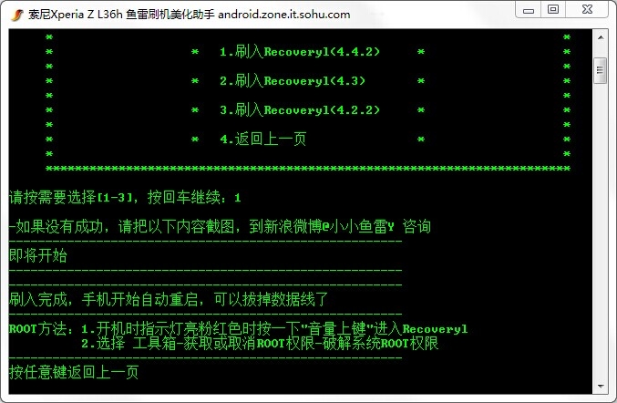2. 啟動魚雷助手,選擇1.刷機(jī)助手,選擇2.刷入ROOT,Recoveryl,選擇1.刷入Recovery(4.4.2);