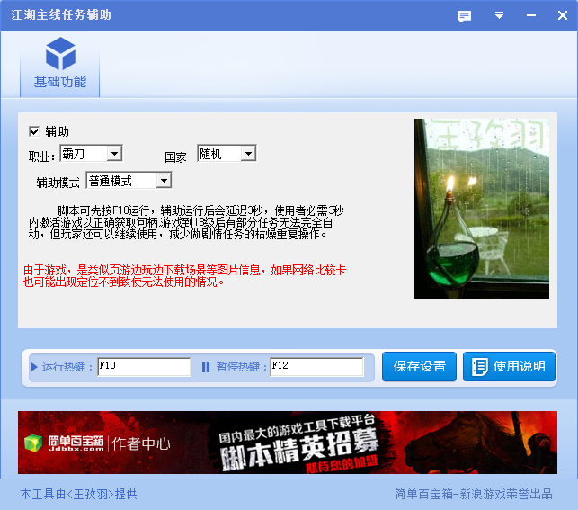 2.啟動江湖新手主線任務(wù)輔助工具,按F10運行工具