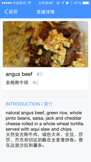 支持中英互譯,只需將攝像頭對準(zhǔn)菜單即可翻譯出對應(yīng)的菜名,點(diǎn)擊菜名即可出現(xiàn)菜品圖片及簡介