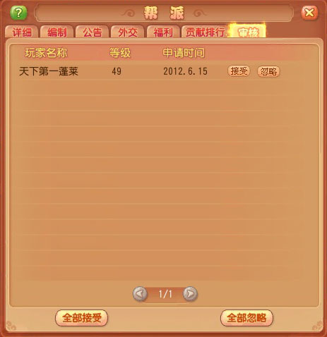 幫主在這個(gè)審核的分頁面上,可以進(jìn)行相關(guān)處理。比如選擇接受修真者的申請加入要求,或者選擇忽略。為了方便幫主管理幫派,還可以選擇進(jìn)行全部接受或忽略的批量處理,讓幫主從繁忙的幫務(wù)中解脫出來!