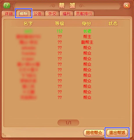 玩家打開“幫派界面”中的“編制”欄,點(diǎn)擊