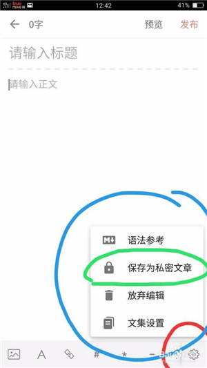 寫作頁面的右下角(紅色標(biāo)注)點(diǎn)擊后會出現(xiàn)如圖(藍(lán)色標(biāo)注)這塊區(qū)域里面可以有一個很重要而且好用的功能,(綠色標(biāo)注)點(diǎn)擊保存為私密文章,可以寫一下自己的私人日記,或者暫時不發(fā)布的文章都可以暫時存起來!