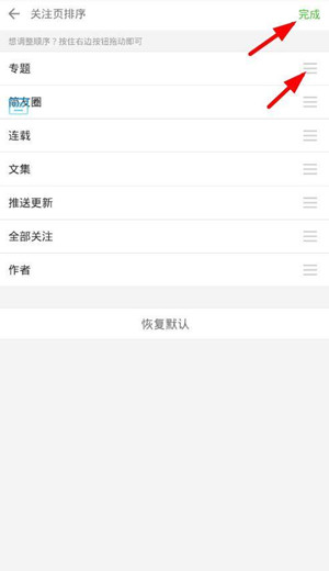 2、接著在關(guān)注頁排序頁面中,按住選項右側(cè)的按鈕,將其上下進(jìn)行拖動調(diào)整順序。調(diào)整完畢后選擇“完成”按鈕。