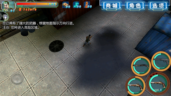 4.右下角是你的武器和虛擬攻擊鍵,你可以選擇你的武器,對(duì)僵尸發(fā)動(dòng)攻擊,到僵尸靠近你時(shí),準(zhǔn)信會(huì)自動(dòng)鎖定僵尸