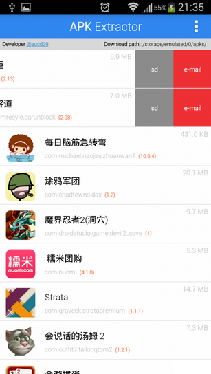 APK提取器只為提取而生前面已說過Apk Extractor的功能非常簡(jiǎn)單,打開后界面也非常的簡(jiǎn)潔,直接顯示的是已安裝的程序名稱,程序的版本號(hào)用紅色字體顯示,顯得比較用心。點(diǎn)右上角的選項(xiàng)按鈕可以設(shè)置默認(rèn)的EMAIL,點(diǎn)程序可選擇提取已安裝程序到SD卡還是通過EMAIL發(fā)送。