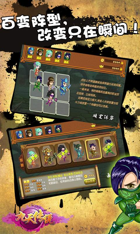 九天傳說(shuō)破解版游戲畫(huà)風(fēng)只能用“質(zhì)樸”二字來(lái)形容了。Q版的人物造型,扁平童話(huà)的背景色彩,使村莊看起來(lái)愈發(fā)的寧?kù)o、和諧。不過(guò)質(zhì)樸村莊里面,住著的村民,嘴可是利的狠。各種狂轟亂炸的吐槽游戲,還有怪物亂入的自夸搞怪,讓你完全忘記了你是在執(zhí)行兩界交戰(zhàn)的重任。在翠綠草原上與怪物你來(lái)我往的攻擊幾下,更像是春游踏青輕松愜意。不要看游戲容量不大,但是該有的系統(tǒng)設(shè)計(jì)還算是很齊全的。單單的英雄站位布陣,就大有學(xué)問(wèn)。排列時(shí)不僅要考慮每個(gè)英雄的屬性特點(diǎn),每種陣型還有著不同的加成。動(dòng)動(dòng)腦筋,小小的玩法也有無(wú)窮樂(lè)趣。雖然裝備系統(tǒng)在游戲中并不太搶眼,不過(guò)基本的品質(zhì)劃分,強(qiáng)化屬性什么的,也是不會(huì)缺少。