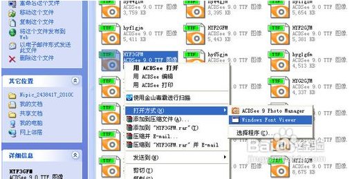 2、假如我們想看某個(gè)英文手寫(xiě)字體是什么樣式的話,可以右擊某個(gè)字體,選擇“windows font viewer“,這是WINDOWS自帶的字體預(yù)覽軟件。如果你電腦上沒(méi)裝ACDSEE或其他看圖軟件的話也可以直接雙擊打開(kāi)。