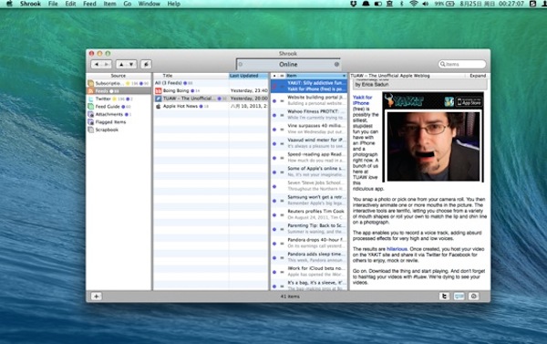 Shrook 分4級菜單操作,從左至右分別是Source – Title/Last Updated – Item – Content/Webpage Preview,初次使用可以從“Source”里的Feed Guide訂閱一些知名網站,不過都是美帝媒體,我們可以自行手動添加Feed地址訂閱自己喜愛的網站;如果文章內帶有視頻等資源,Shrook會將其視為帶有“附件”的內容并自動歸類到“Attachment” 組,遇到喜歡的文章可以拖入Scrapbook收藏。【軟件特色】
