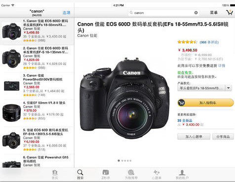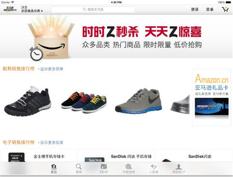Amazon最早是一家網(wǎng)上書店的,后期轉(zhuǎn)型最網(wǎng)上購物,如今做到全球最大電商公司。有了亞馬遜iPad版你可以自由的訪問Amazon.co.uk、Amazon.de、Amazon.fr、Amazon.com、Amazon.it、Amazon.cn或 Amazon.co.jp 購物。