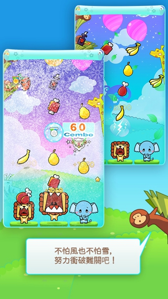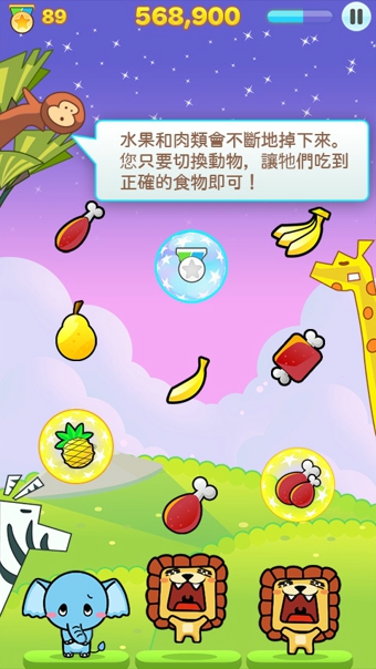 肉類和水果會從畫面上方掉下來,您只要點選手機畫面來切換動物,分別喂食喜歡的肉類或水果即可。