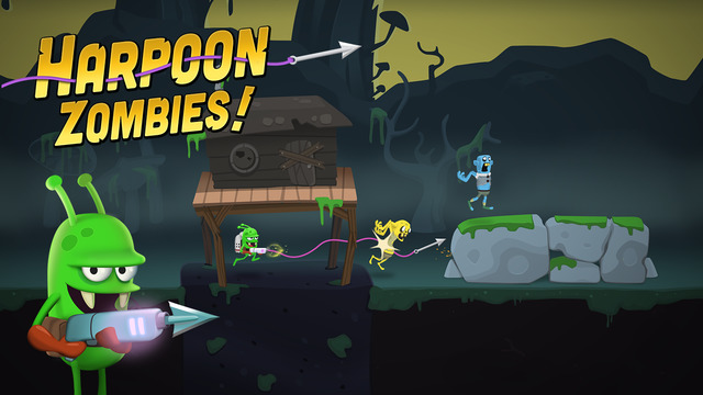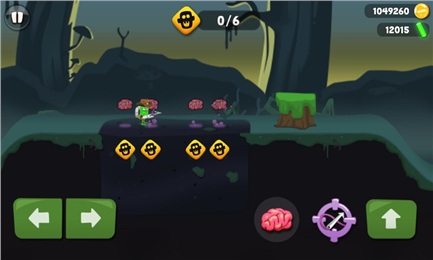 僵尸獵手游戲中綠皮怪與機(jī)器人小伙伴駕駛著一艘飛碟到一片沼澤中尋找外星人的蹤跡,當(dāng)飛碟停止時(shí),就可以降落開(kāi)始進(jìn)行抓捕僵尸的游戲了。僵尸們都躲在地下,有僵尸的地方會(huì)出現(xiàn)一個(gè)大腦的圖標(biāo),玩家需要丟出粉紅色的腦子去引誘僵尸們,不過(guò)這些僵尸都是一些膽小的家伙,丟下腦子后僵尸所處的地方就會(huì)出現(xiàn)一個(gè)感嘆號(hào),遠(yuǎn)離感嘆號(hào)至不會(huì)變成黃色的位置,僵尸們就會(huì)爬出來(lái),這時(shí)候就趕緊抓住機(jī)會(huì)趕上去使用SM皮鞭將僵尸捕獲。