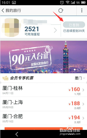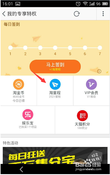 5、點擊右上角的【簽到】按鈕,在左邊在顯示可用淘里程,這樣在阿里旅行去啊和淘寶簽到的總數(shù)在這里進(jìn)行顯示。也可在阿里旅行去啊,也可顯示簽到總數(shù)。