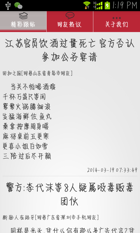 2003年12月3日,網(wǎng)易新聞第一天跟帖出現(xiàn),打破了新聞只能看不能互動(dòng)的陳規(guī),得到了廣大網(wǎng)友的熱情參與,跟帖是廣大人們?nèi)罕娂w智慧的結(jié)晶,眾多新聞的精彩跟帖,最熱跟帖,匯集到一起,讓你一次看個(gè)夠。