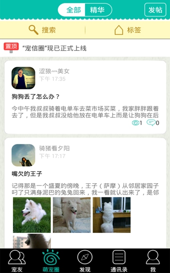 2.萌寵圈添加分類功能(包含全部、汪星人、喵星人等),快速找到心儀帖子