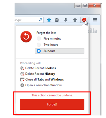 細節(jié)功能上的完善,包括忘記(Forget)按鈕、增強版快速導航(Enhanced Tiles)、隱私保護教程、DuckDuckGo搜索引擎。“忘記”按鈕位于工具欄(需要通過定制添加),可手動刪除5分鐘、2小時、24小時內(nèi)的歷史記錄、Cookies,并關閉所有的窗口和標簽頁,再打開一個新的干凈窗口。