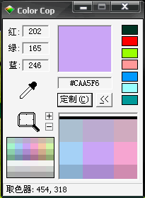 Color Cop V5.4.5 漢化綠色特別版 Color Cop 是一款適合網(wǎng)頁設(shè)計師,程序員使用的多用途的顏色采取器。它包含多種功能特性,具有取色器,放大鏡,不同點陣的采樣,抓取為網(wǎng)頁安全色,顏色歷史記錄和一個輔助的調(diào)色板。同時,Color Cop 也可以將 RGB 十進(jìn)制轉(zhuǎn)換為十六進(jìn)制顏色代碼