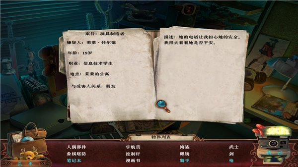 致命謎題玩具制造者是一款冒險解謎游戲,一個神秘的連環(huán)殺手開始殺害年輕女性,地方政府試圖找出這個人卻陷入了他的圈套,案件毫無進展。他的作案特點就是在作案現(xiàn)場丟棄一個奇怪的玩具,因此,媒體稱其為“玩具殺手”!負責調查此案的偵探亦認為抓獲兇手無望。可是,兇手寄來的一個裝有錄像帶的包裹改變了這一切。為了找到這個精神病患者,我們的女主角必須找出兇手在犯罪現(xiàn)場留下的線索,以及受害者之間的關系。接受了殺手的挑戰(zhàn)是否意味著參加了一場與注定要逝去的時間對抗的比賽?她最終會確定兇手的身份并阻止了他的殺人計劃,還是會成為下一位受害者?