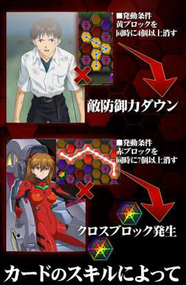 在新世紀福音戰(zhàn)士游戲戰(zhàn)斗中,玩家只需要在屏幕下方,把相同顏色的方塊用手指連在一起并消除,就能對敵人發(fā)動攻擊。消除的方塊是有屬性設(shè)定的,與消除的方塊相同屬性的角色才會發(fā)動攻擊。當(dāng)然,消除的方塊越多,攻擊力越厲害,而除了攻擊之外,消除粉紅色方塊就能回血。此外,只要滿足特定條件,就能發(fā)動“技能”,而角色發(fā)動時,還會有專有動畫哦!