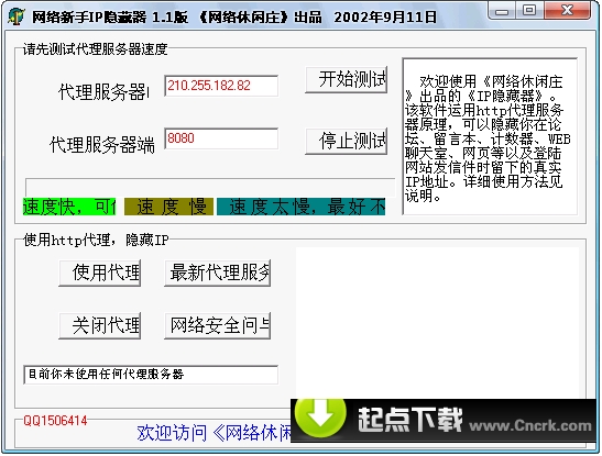 網(wǎng)絡(luò)新手IP隱藏器 V1.10 簡體中文綠色免費(fèi)版 該軟件運(yùn)用http代理服務(wù)器原理,可以隱藏網(wǎng)絡(luò)新手在論壇、留言本、計數(shù)器、WEB聊天室、網(wǎng)頁等以及登陸網(wǎng)站發(fā)信件時留下的真實(shí)IP地址。中文界面,簡單易懂,具有“一鍵代理”的感覺,并且可以隨時在線查詢最新代理服務(wù)器,還可以查詢QQ代理服務(wù)器(QQ上隱藏IP用),特別適合于網(wǎng)絡(luò)新手上網(wǎng)時隱藏自己的IP時使用