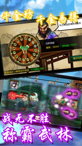 華山論劍:在游戲中,江湖各大門派精英云集華山頂峰,為爭(zhēng)天下武學(xué)第一的名號(hào),刀光劍影,各顯奇能。在這里,只要你的功夫夠高、夠好,定能笑傲群雄,名留青史。