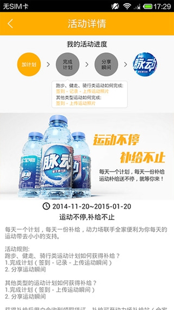 科學(xué)的運動應(yīng)該注意適當(dāng)?shù)难a給,一場酣暢淋漓的運動計劃完成后,流失的體力和汗液急需得到補充,此時一瓶運動飲料是運動者最好的補給。動力場為運動愛好者帶來線下現(xiàn)實生活中數(shù)千家合作的補給站,不同類型的補給站可以為運動者提供食品飲料或是運動裝備的補給。動力場為你每天的運動帶去小小的支持。