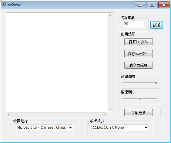 txt2wav(文本轉(zhuǎn)換語(yǔ)言工具) v1.0 綠色版 文本轉(zhuǎn)換語(yǔ)言工具是一款可以將文本轉(zhuǎn)換成語(yǔ)音的小工具。該工具小巧不占內(nèi)存,且綠色無病毒,簡(jiǎn)單易用。它是根據(jù)網(wǎng)上txt2mp3,Balabolka等工具仿制,可以說應(yīng)用范圍很廣。